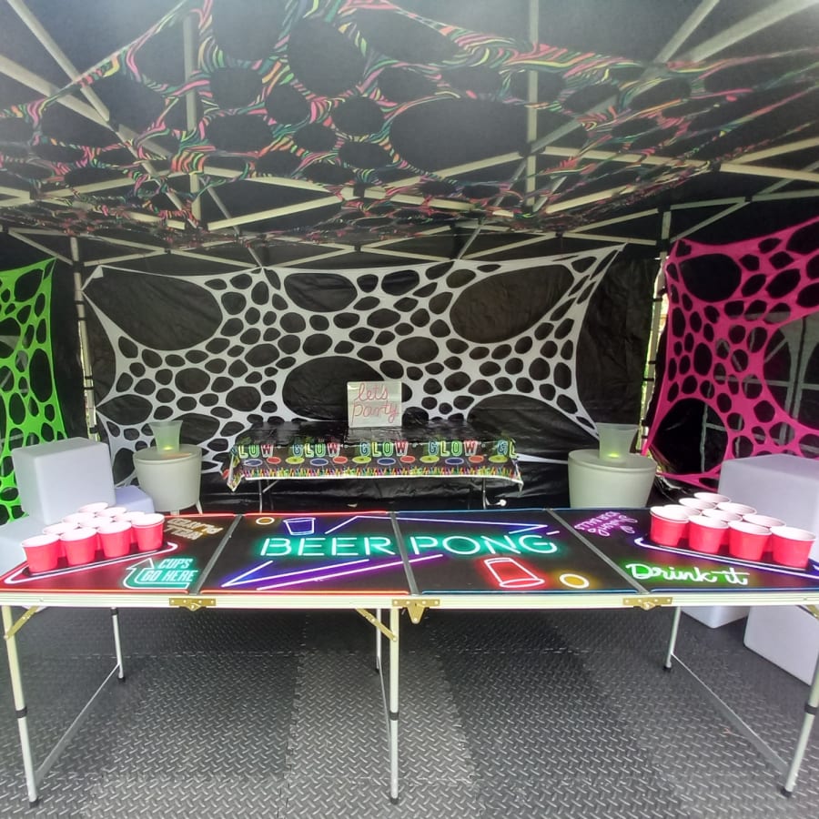 Our Beer Pong Table is not only sturdy, easy to set up, and affordable at just £55 for the day, it's also incredibly cool with its glow-in-the-dark design. The table comes equipped with LED lights that make it the perfect addition to any late-night party or event.